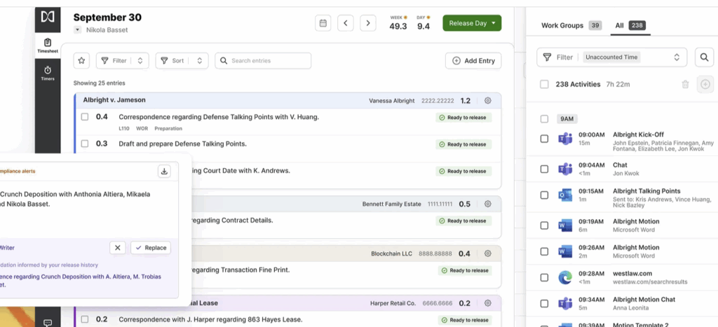 예를 들어 변호사가 요약판결 신청서를 준비할 때 관련 PDF, 워드 문서, 이메일 작업을 한 활동 흐름으로 묶는다. 이를 통해 업무시간 데이터를 사업성과와 연결할 수 있고, 어디에 AI 자동화를 적용할지 결정하는 데도 활용할 수 있다.