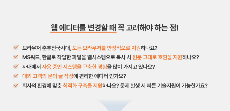 MS워드 등 오피스 문서작성 솔루션과 웹에디터간의 호환성이 우수한 지, 다수 유저의 요구사항을 반영한 구축경험이 있는지, 마지막으로 도입에 그치지 않고 문제 발생 시 빠르고 안정적인 기술 지원이 가능한 지를 고려해야 합니다.