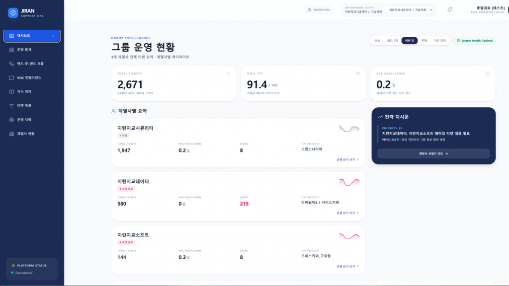 JiranSupport는 흩어져 있던 고객 지원 데이터를 하나의 플랫폼에 모읍니다. 그룹 전체의 티켓 현황, 고객사별 해결 건수, 안정도 지수, 평균 해결 소요 시간. 핵심 KPI가 메인 대시보드에서 실시간으로 잡힙니다. 계열사별 운영 상태는 색상으로 구분되고, AI가 자동 분석한 전략 지시문이 즉각적인 우선순위 대응을 가이드합니다.