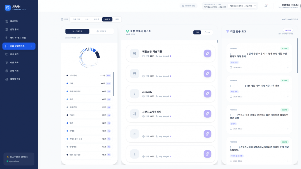 고객의 소리(VOC)도 체계적으로 분류됩니다. 기능 문의, 인증서, DNS, 취약점 대응 등 40여 개 카테고리로 자동 분류되고, VIP 고객사 관리 기능과 실시간 라이브 피드를 통해 중요 고객의 동향을 즉시 파악할 수 있습니다.
