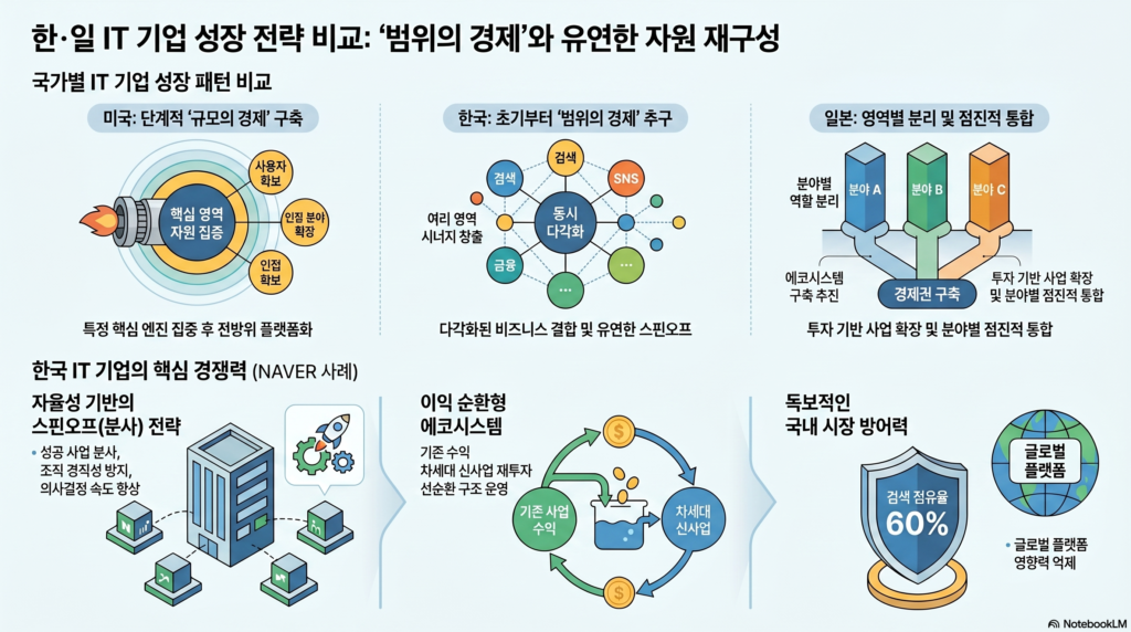 일본과 한국 IT 기업의 발전 패턴을 비교해 보면, 한국 기업의 강점은 ‘변화 대응력’, ‘자원의 빠른 재구성 능력’, 그리고 ‘초기부터 시너지를 창출하는 전략적 사고’에 있음을 알 수 있습니다.