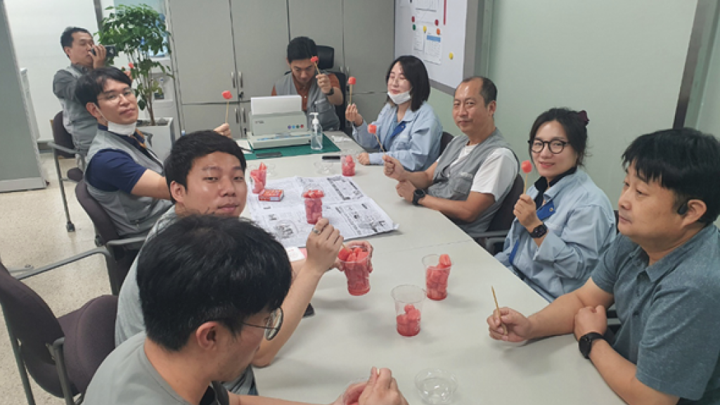 밤낮없이 보안에 신경 써 주시는 선생님들과 청결을 위해 늘 노력해주시는 선생님들, 그리고 판교 신사옥의 완공을 위해 무더위 속에서도 고생하시는 현대건설 직원분들과도 즐거운 수박파티를 함께 했습니다.