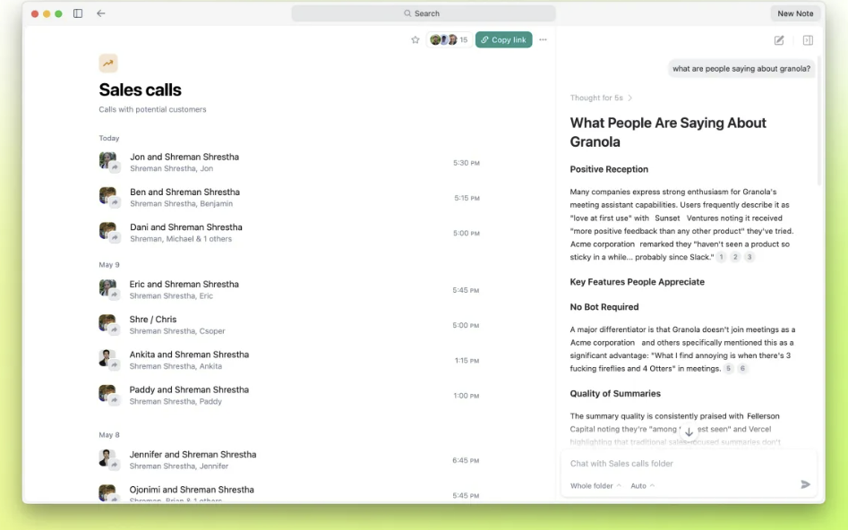 Granola는 사용차 확대에도 속도를 내고 있다. 기존에는 1인 사용자 중심이었다면, 앞으로는 협업 기능을 강화해 팀 단위 활용으로 진화할 계획이다. 회사 측에 따르면 사용자들은 회의 기록과 메모를 팀원과 공유할 수 있고 영업, 고객 피드백, 채용 등 용도별로 폴더를 만들 수 있다.