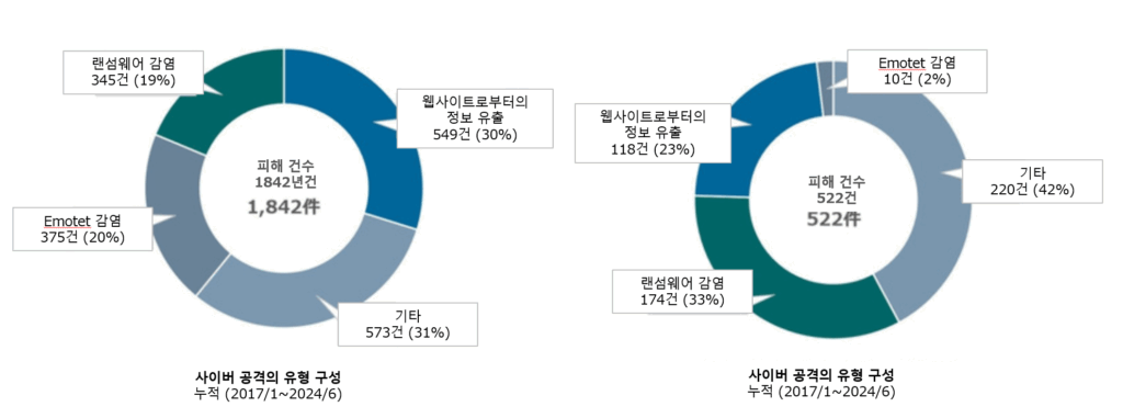 사이버 공격의 유형 구성을 살펴본 결과, “웹사이트로부터의 정보 유출”이 594건(30%), “기타”가 573건(31%), “에모텟(Emotet) 감염”이 375건(20%), “랜섬웨어 감염”이 345건(19%)이었습니다.그러나 최근 2년간에는 “에모텟(Emotet) 감염”이 10건(2%)으로 크게 감소한 반면, “랜섬웨어 감염”은 174건(33%)으로 확대된 것으로 확인되었습니다.
