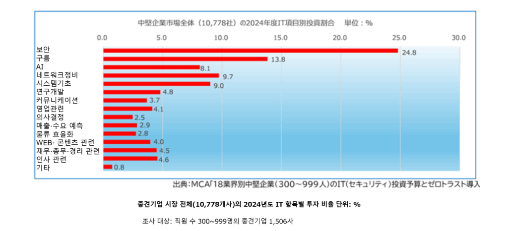 중견기업의 IT 투자에서 보안 분야가 전체의 24.8%를 차지하며, 현저히 높은 비중을 보였습니다.