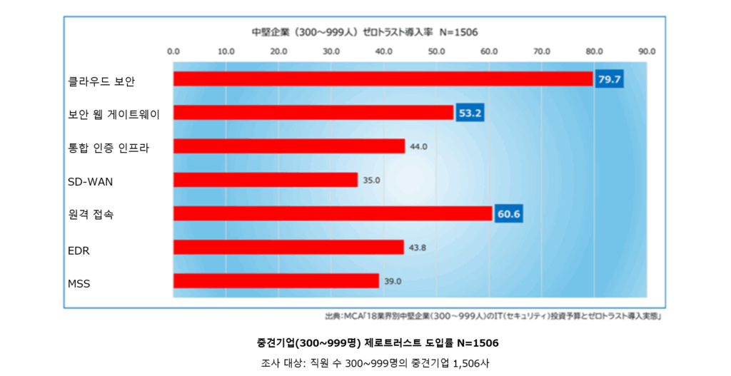 중견기업의 제로트러스트 컴포넌트 도입률을 보면, “클라우드 보안”이 79.7%, “원격 접속”이 60.6%, “보안 웹 게이트웨이”가 53.2%로 상위를 차지하며, 중견기업의 절반 이상이 이미 도입한 것으로 확인되었습니다.