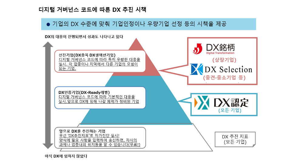 일본 경제산업성은 DX추진을 위해 기업이나 경영자가 실시해야 할 사항을 「디지털 거버넌스 코드」로 정리해 모든 사업자를 대상으로 한 대처추진을 위한 나침반으로서 활용하도록 촉구하고 있습니다. 기업 규모마다 DX 레벨에 따른 기업 인정과 우량 기업 선정을 매년 실시하고 있습니다.